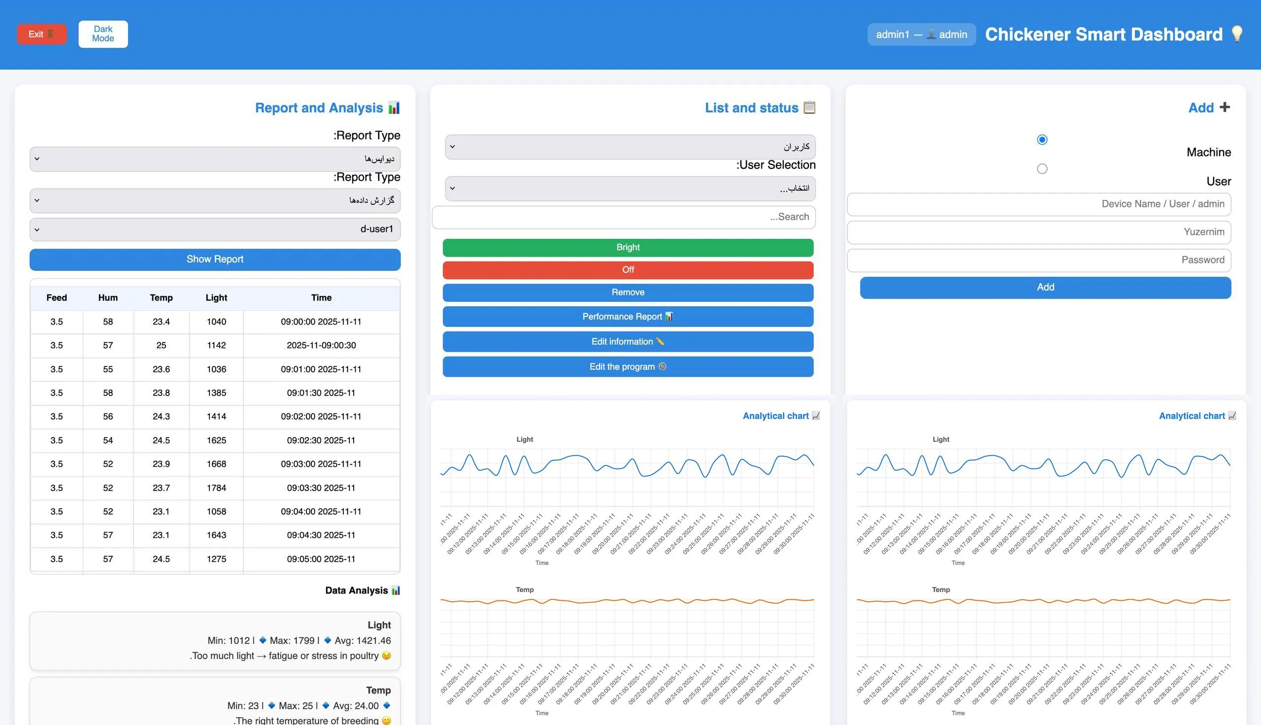 This platform allows users to set feeding programs, track environmental data such as temperature, humidity, and gases, and access detailed performance reports in real time.